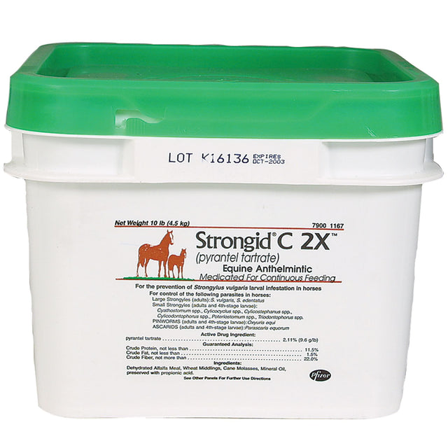 STRONGID® C 2X™ (pyrantel tartrate) 10lb pail for horses. STRONGID® C 2X™ (pyrantel tartrate) is an equine anthelmintic designed to be fed on a daily basis to provide a continuous, preventive level of pyrantel in the intestinal tract. STRONGID C 2X prevents migration of large strongyle larvae.