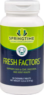 Springtime Fresh Factors 180 Tabs Easy to feed chewables highly palatable. Promotes strong joints and bones. Restores bloom in older dogs. Fresh Factor 180 Chewable Tabs for Dogs from Springtime. Prevents hip and joint problems in younger dogs. Helps give all dogs a luxurious coat and itch-free skin. Enhances digestion/reduces stool size, cleanup. Promotes a playful, upbeat attitude. Helps calm nervous, high-strung types. Over 210 million sold. Provides raw food factors necessary for a dogs optimal health. Contains equivalent of 10,000 mg of cartilage (50 to 1 concentrate) per tablet. Directions: Just toss them into the regular feed ration or feed as treats. Small dogs Under 40 lb 1 per day Medium dogs 40-80 lb 2 per day Large dogs 80-120 lb 3 per day Giant dogs 120 lb & up 4+ per day.