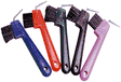 Hoof Pick/Brush combo for horses. Tempered steel Hoof Pick with super stiff nylon bristle brush and hard plastic handle. Available in red, royal, black, green and purple. 6" long. Sold individually.