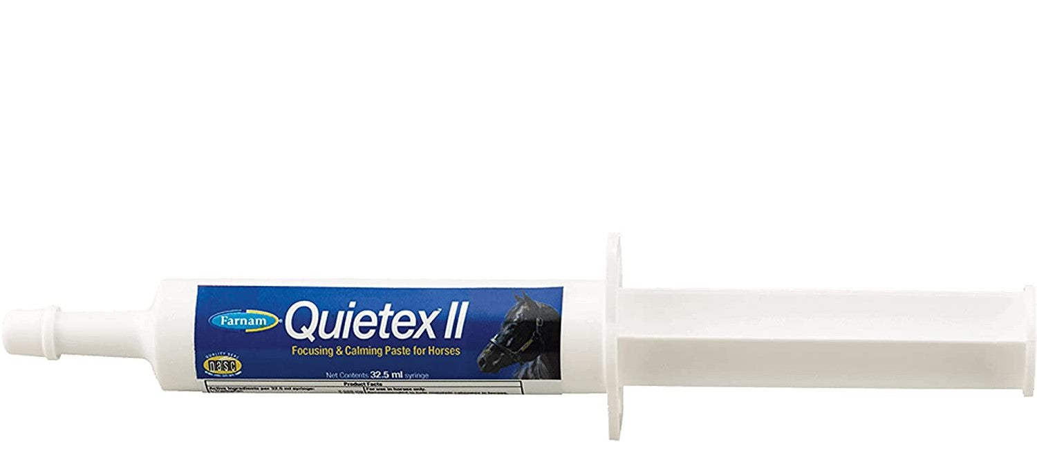 Quietex is a supplement designed to help keep performance horses calm and focused in stressful situations. Won't cause drowsiness or affect performance. Contains a unique combination of 7 active ingredients designed to keep your horse calm and focused. Great for use in heavy training, performance activities or racing.