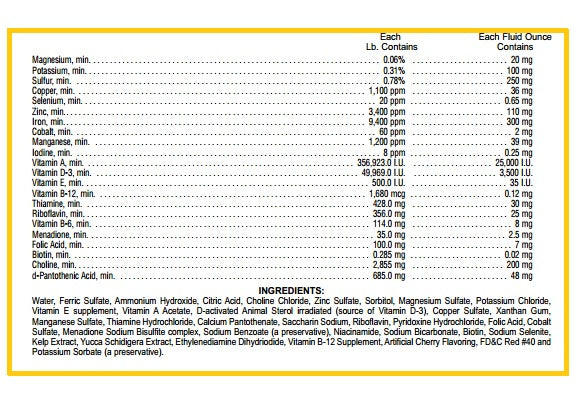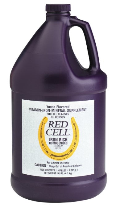 What is Red Cell Liquid Feed Supplement for Horses? The #1 rated liquid feed supplement in the world! Red Cell Liquid Feed Supplement for Horses is a palatable yucca-flavored supplement formulated to provide important vitamins and minerals that may be lacking in your horse's daily diet. Who is Red Cell Liquid Feed Supplement for? Horses How is Red Cell Liquid Feed Supplement for Horses used? FEEDING DIRECTIONS: Horses in training: Feed 2 fluid ounces of Red Cell® supplement daily. Horses not in training: Feed 1 fluid ounce of Red Cell® supplement daily. Feed Red Cell® supplement by mixing into daily feed ration or orally with a dose syringe. IMPORTANT: Intake of supplemental selenium should not exceed 0.3 ppm on a complete ration basis. Store in a cool, dry place. Shake well before using. Keep from freezing. Close container after each use. Caution: Follow label directions. The addition to feed of higher levels of this premix containing selenium is not permitted. Store in area inaccessible to children and animals. Excessive amounts of selenium may be toxic. This product should not be fed to copper sensitive animals, such as sheep. How much Red Cell Liquid Feed Supplement for Horses do I get? Red Cell Liquid Feed Supplement for Horses comes in a gallon container.