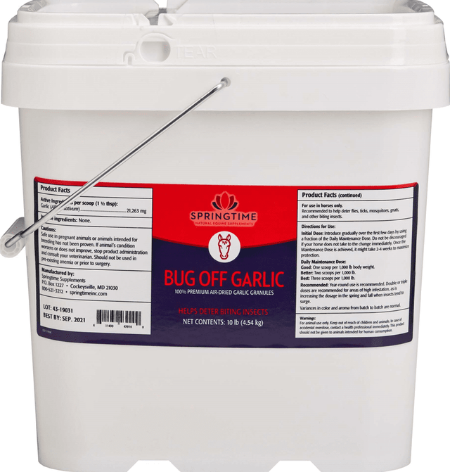 Springtime Bug Off Garlic 10lb pail for Horses. Natural herbal feed supplement. No toxic side effects no fillers. Provides organic dietary sulfur. Horses and dogs love the flavor. No spray on hassles. Economical. Was in use prior to the development of antibiotics.