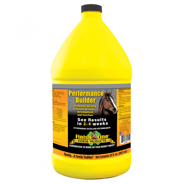 Performance Builder Gallon Performance Builder is a new equine supplement from Finish Line which promotes healthy muscle development and function in performance horses. Results can be seen in weeks instead of months. With only the best quality ingredients like Gamma Oryzanol (from rice bran), Calcium HMB and L-Leucine it's no wonder that this product works so well. Safe and effective for weanlings and older horses. The butterscotch taste makes it highly palatable. Usage: Give One Fluid Ounce Daily.