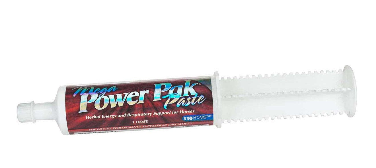 Mega Power Pak Paste An herbal Pre-Event supplement that helps support energy, endurance, breathing and blood oxygen levels. Mega Power Pak Paste contains the concentrated performance ingredients, Creatine Ethyl-Ester, L-Arginine Alpha Keto-Glutarate, DMG and an Herbal Breathing Blend. These ingredients mixed together help your horse to finish the event strong. Mega Power Pak Paste will not test and can be used on event day.