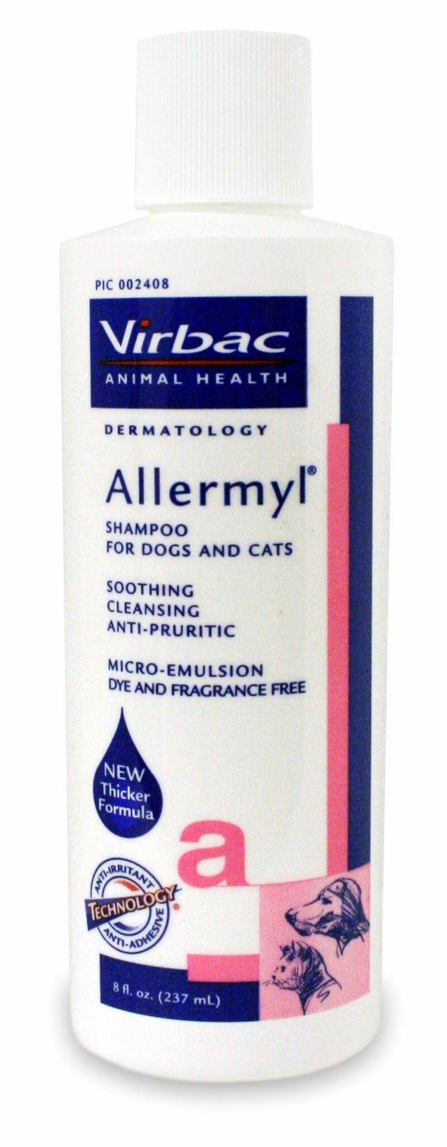 Allermyl Shampoo 8oz for cats and dogs. Allermyl Shampoo is a unique shampoo for the management of allergic skin conditions in dogs and cats. Contains a soothing combination of natural anti-inflammatory ingredients, mild cleansing agents and essential fatty acids. The foaming micro-emulsion helps the ingredients penetrate the skin for deep soothing relief. Helps maintain skin barrier integrity and microbial balance. Active Ingredients: Piroctone Olamine 0.5%. Inactive Ingredients: Alkylpolyglucoside, Butylene Glycol, Citric Acid, Coco-Betaine, d-Galactose, d-Mannose, Disodium EDTA, l-Rhamnose, Laureth-2, Methylpropanediol, PEG-90 Glyceryl Isostearate, Peumus boldus Leaf Extract, Purified Water, Skin Lipid Complex (Ceramides, Fatty acids), Sodium Laureth Sulfate, Spiraea ulmaria Extract, Vitamin F, ans xanthan gum.