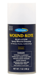 Wound-Kote™ 7oz Spray for horses, dogs & cattle. THIS ITEM SHIP VIA GROUND ONLY. Spray on wound dressing for surface wounds, minor cuts and skin abrasions. Coats the wound, disinfects and aids in early scab formation. Not easily rubbed or washed off. A great aid against bacterial infections common in skin lesions. Convenient 5 oz. non-fluorocarbon aerosol.
